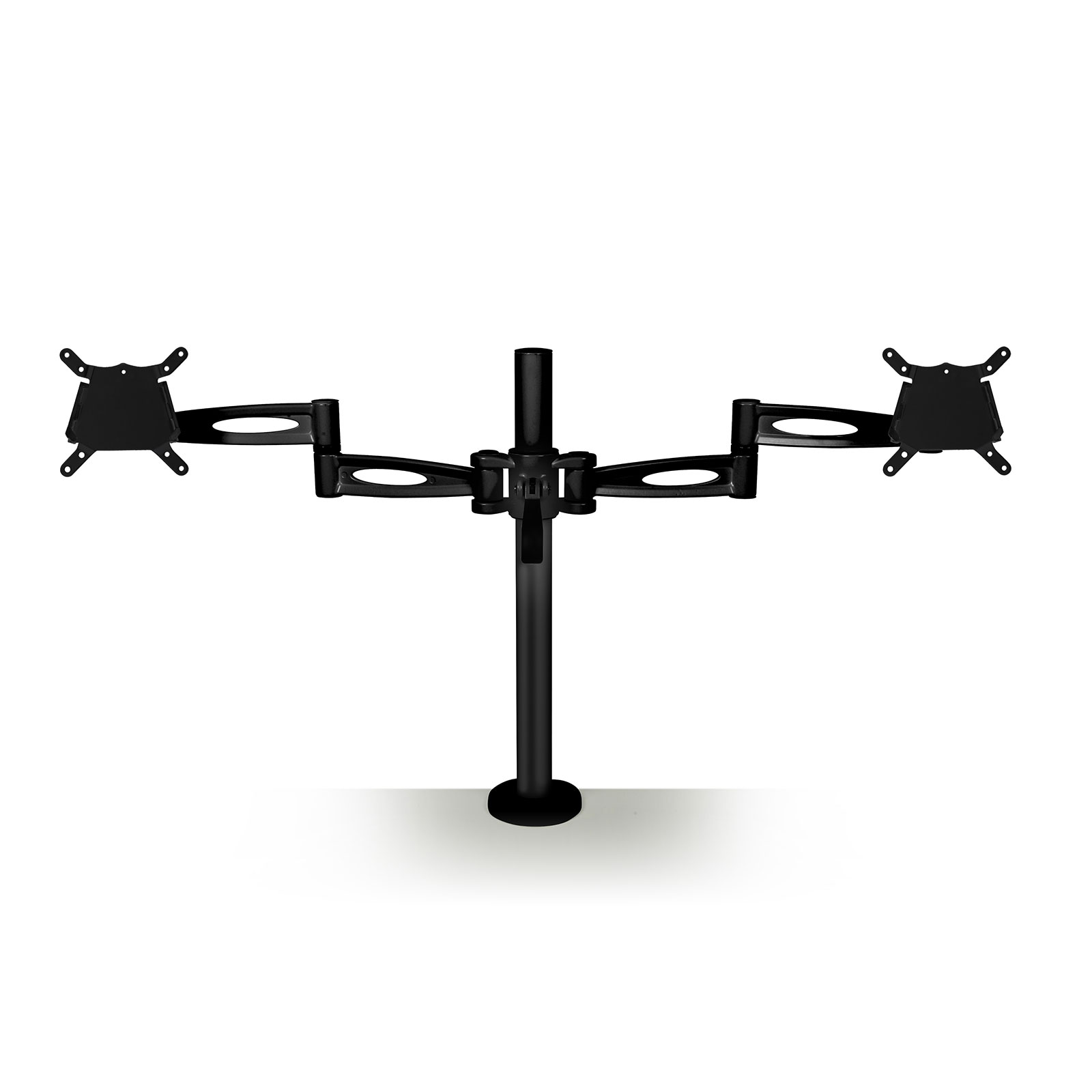 The New "Kardo" dual monitor arm black has arrived in stock ! This robust arm is designed with all of the ergonomic adjustable features you will require for your monitors. It includes quick release head design, height adjustment on the central pole, tilt and swivel feature to the monitor attachment bracket, cable management clips and two different styles for mounting including bolt through and G-clamp. Takes two screens up to 32 inches. Fira Certified product (International Testing Body) - 5 year warranty