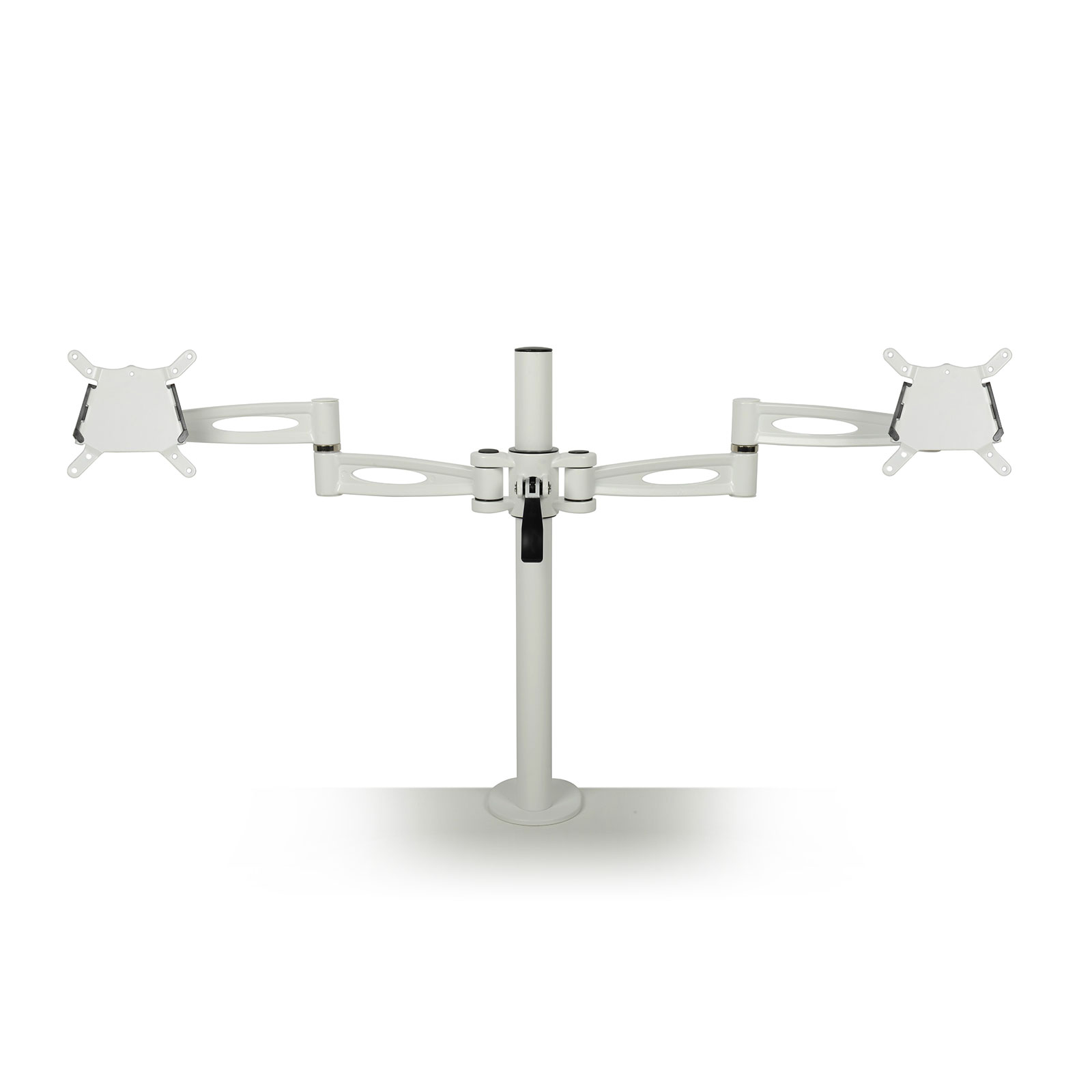The New "Kardo" dual monitor arm white has arrived in stock ! This robust arm is designed with all of the ergonomic adjustable features you will require for your monitors. It includes quick release head design, height adjustment on the central pole, tilt and swivel feature to the monitor attachment bracket, cable management clips and two different styles for mounting including bolt through and G-clamp. Takes two screens up to 32 inches. Fira Certified product (International Testing Body) - 5 year warranty